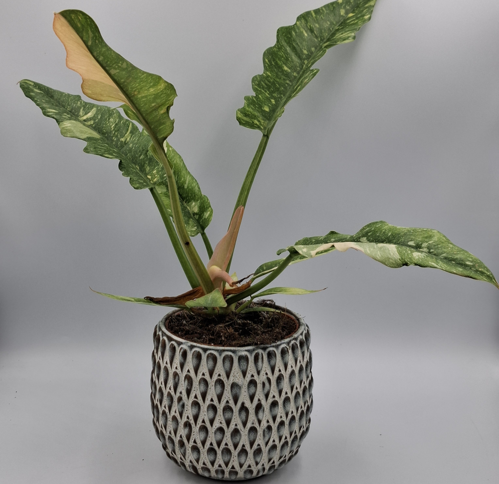 16 cm-es cserépben. Szép mintázattal. Szeldelt és fenesztrált nagy méretű levelek.