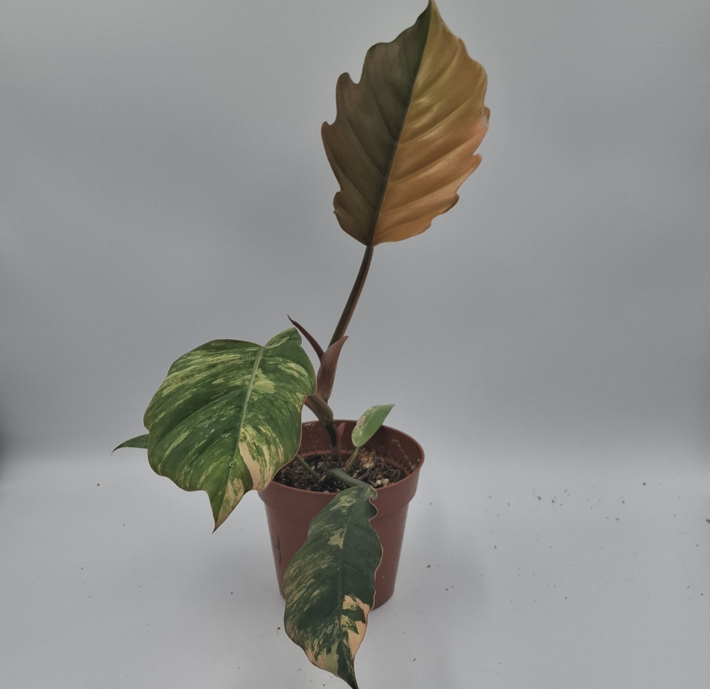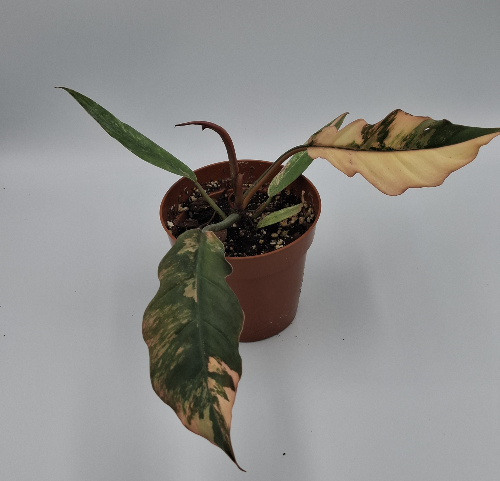 Ez a ritka, gyönyörű variegált philodendron színvilága krém, karamell, bronz, zöld és gyakran élénk rózsaszín árnyalatokat mutat, levélenként egyedi mintázatban.
