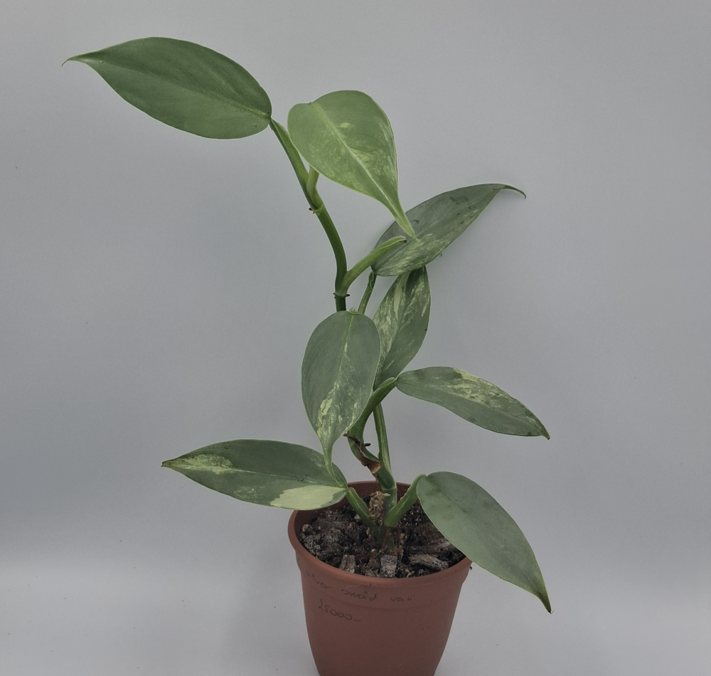 Ritka, dekoratív, ezüstös-zöld levelekkel és erősebb világos/krémszínű foltjakkal díszített philodendron-változat. A variegata részek kevesebb klorofillt tartalmaznak, ezért néhány gondozási szabályra érdemes külön odafigyelni, hogy megőrizd a variegációt és az egészséget.