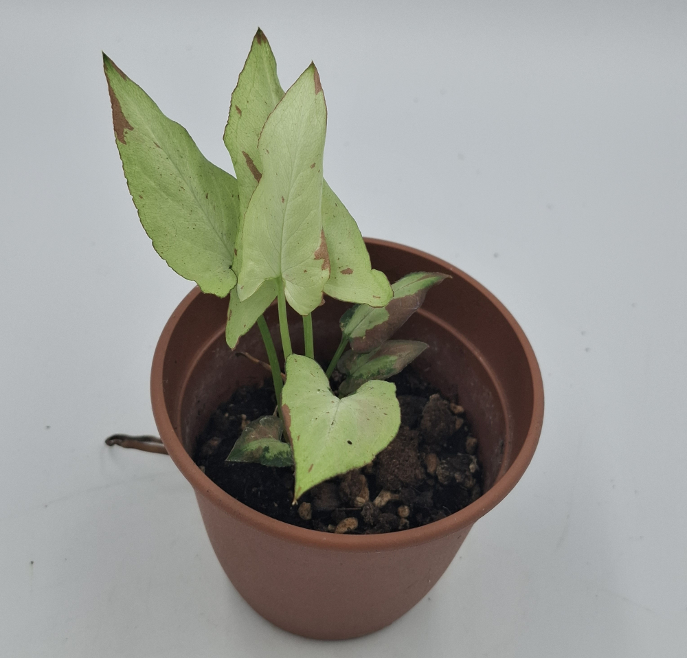 A levelek nyílhegy‑ vagy nyíl‑szerű formájúak, amelyek krém‑fehér-rózsaszín és világoszöld mintázattal márványozottak – minden levél egyedi mintázatot mutat.