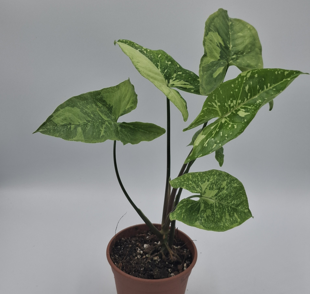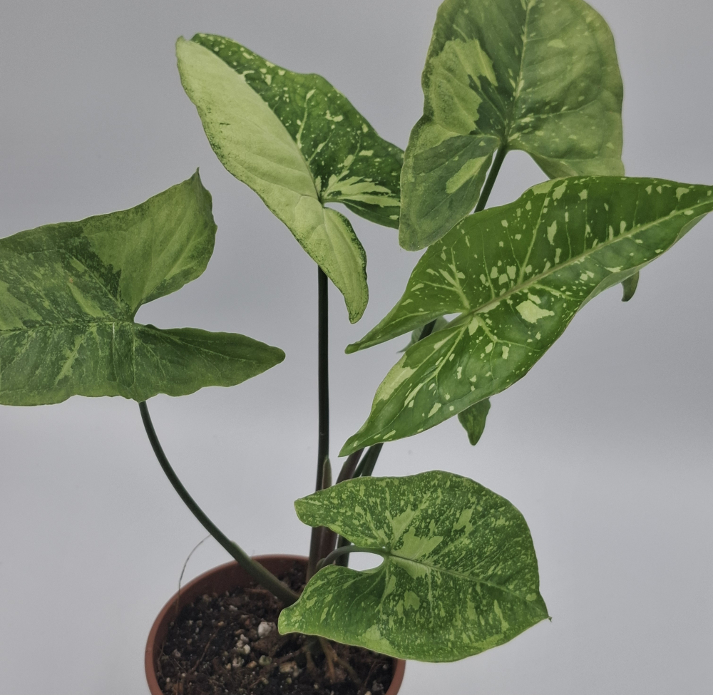 Trópusi eredetű, a Syngonium nemzetséghez tartozik. Jellemző rá a szabálytalan fehér/krém foltozottság („galaxy/panda” mintázat).