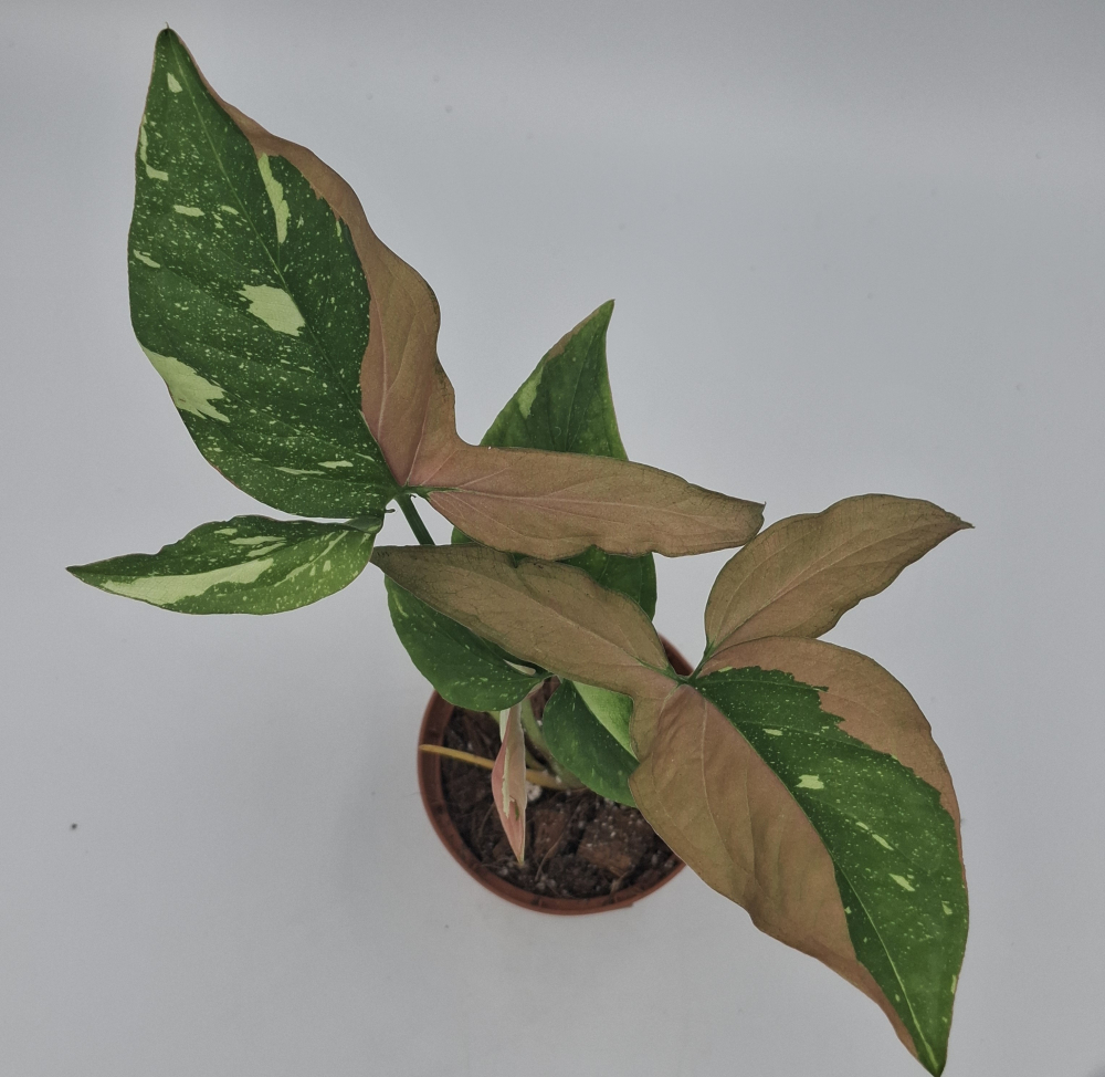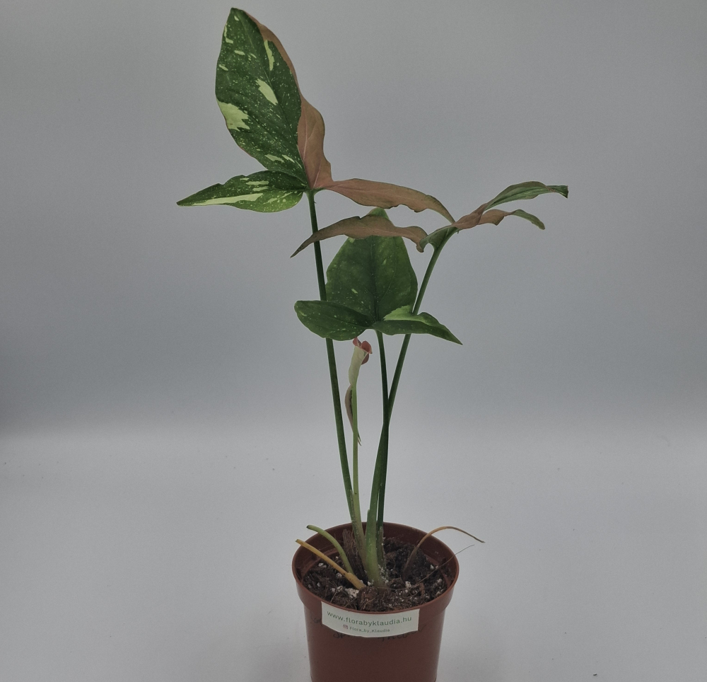 Hibrid Syngonium podophyllum fajta, különleges hármas (tricolor) levél-rajzolattal: zöld alap, krémes és rózsaszín foltokkal, illetve vörös pöttyökkel a levéllemez idősebb levelein